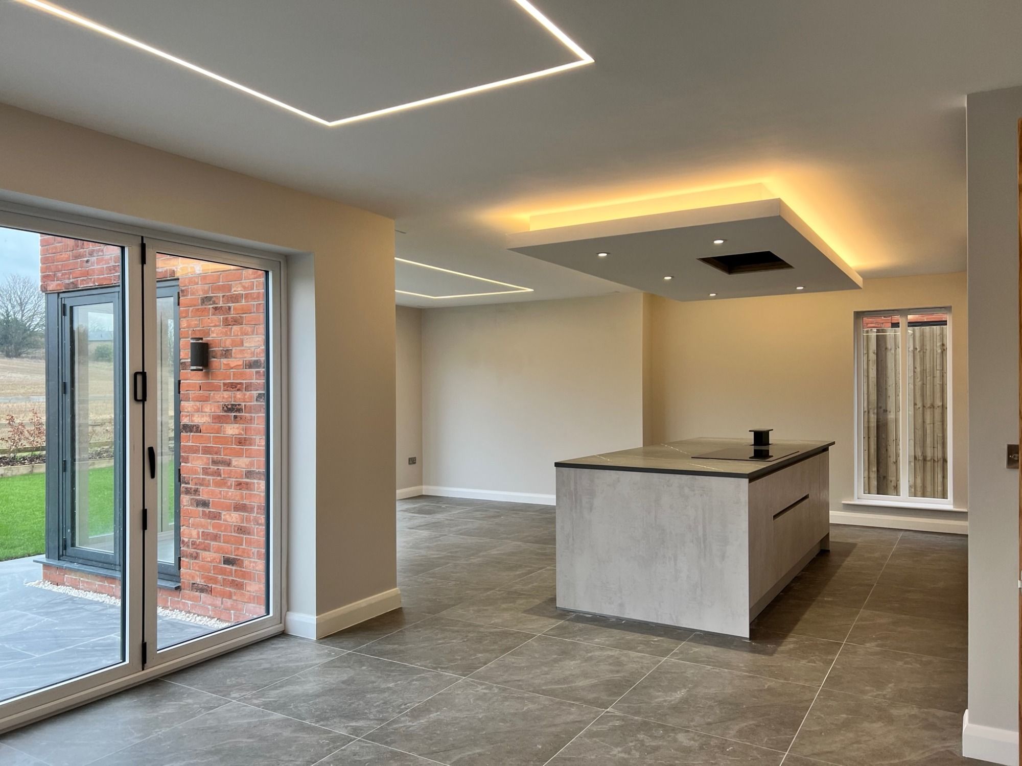 Two absolutely stunning kitchens, supplied and installed by Birkdale Kitchen Co. Two different styles, but equally beautiful. When working with different shaped rooms or unusual room layouts and lighting, its important to not just 'Copy & Paste' designs from one property to the next, so with Plot 5 we tried to offer something a bit different. Corner shelving, a peninsular rather than a kitchen island and wooden look floor rather than large tiles are just some examples of the differences and changes we made in this Plot.