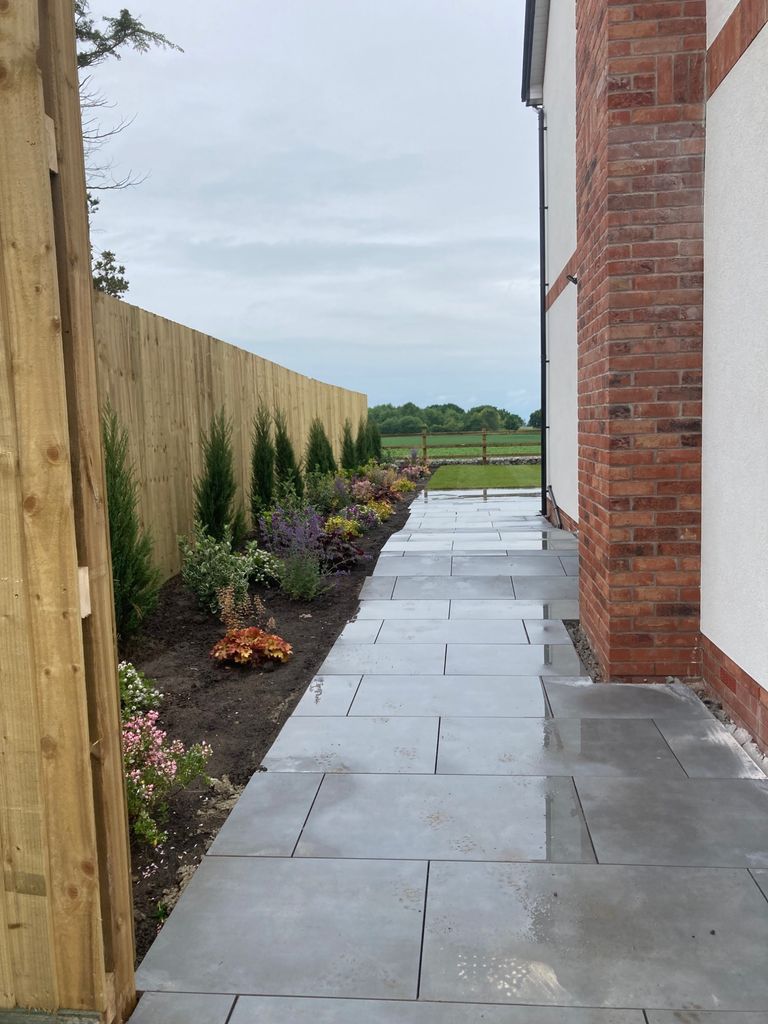 Groundwork transformations have taken place this month. The porcelain tiles have gone down around plot 4 and turf has been laid and plants added to the boarders.