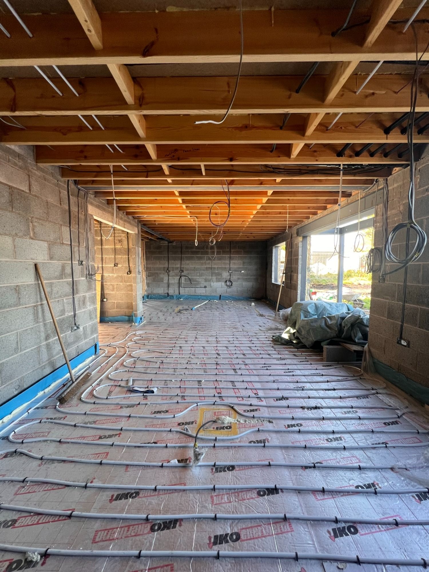 A lot of preparation goes into pouring a concrete slab on a newbuild. The ground is lined with a waterproof membrane on which the concrete sits and is protected from damp occurring. We use a laser level to ensure that the concrete is set level and tools are used to remove air pockets from the concrete before it sets.