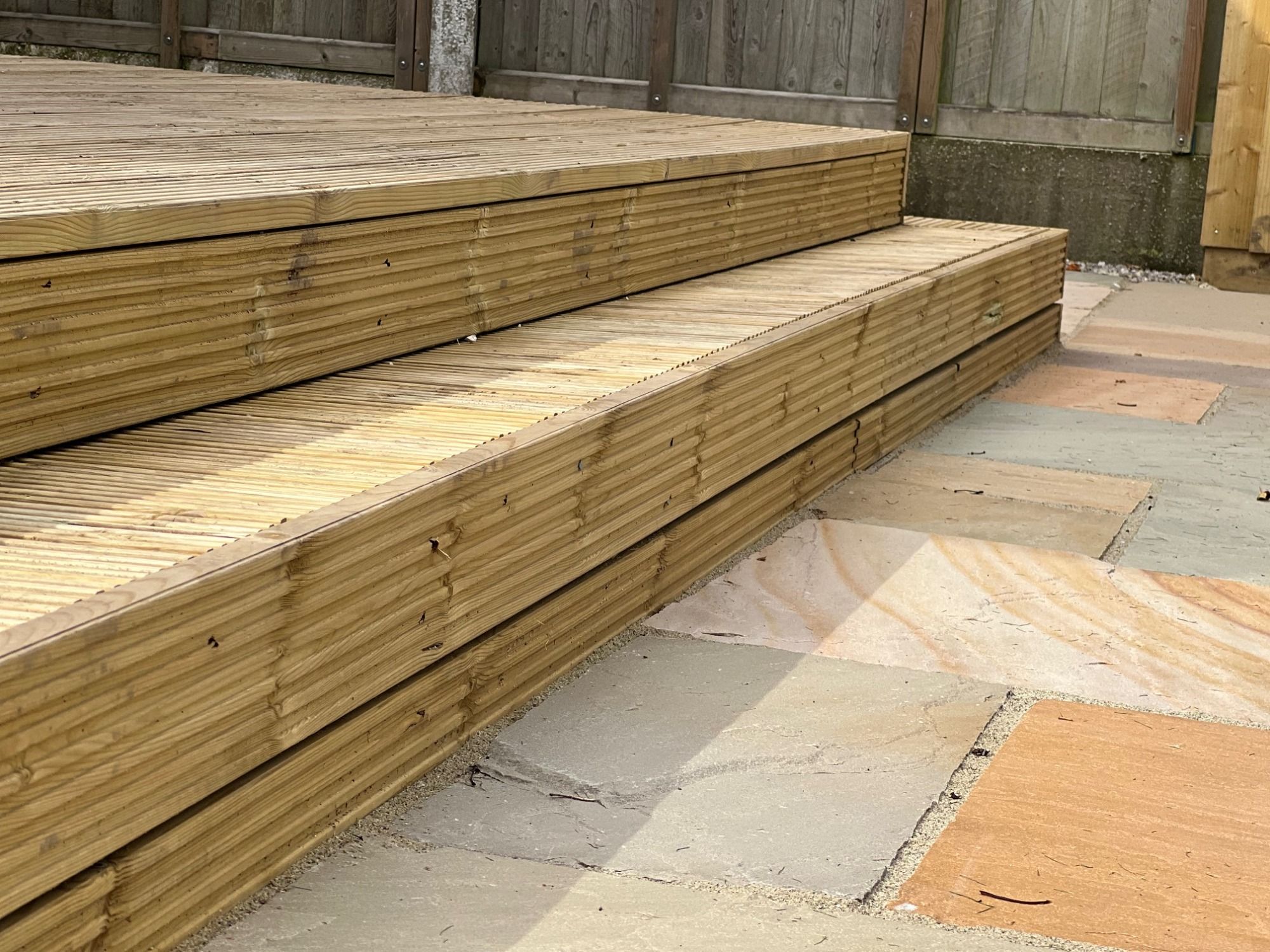 - decking and indian stone patio in the garden